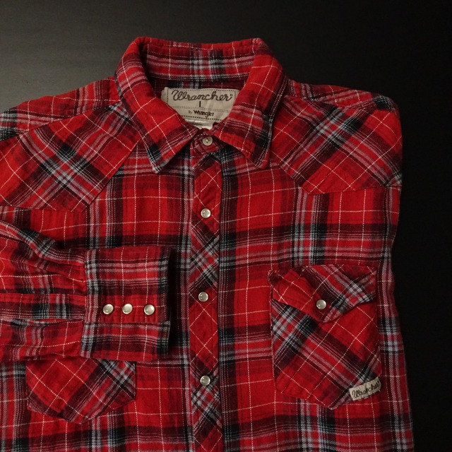 90s- Wrangler ラングラー 長袖ネルシャツ ランチャー チェック柄 ウエスタン 襟芯 90年代~ レッド