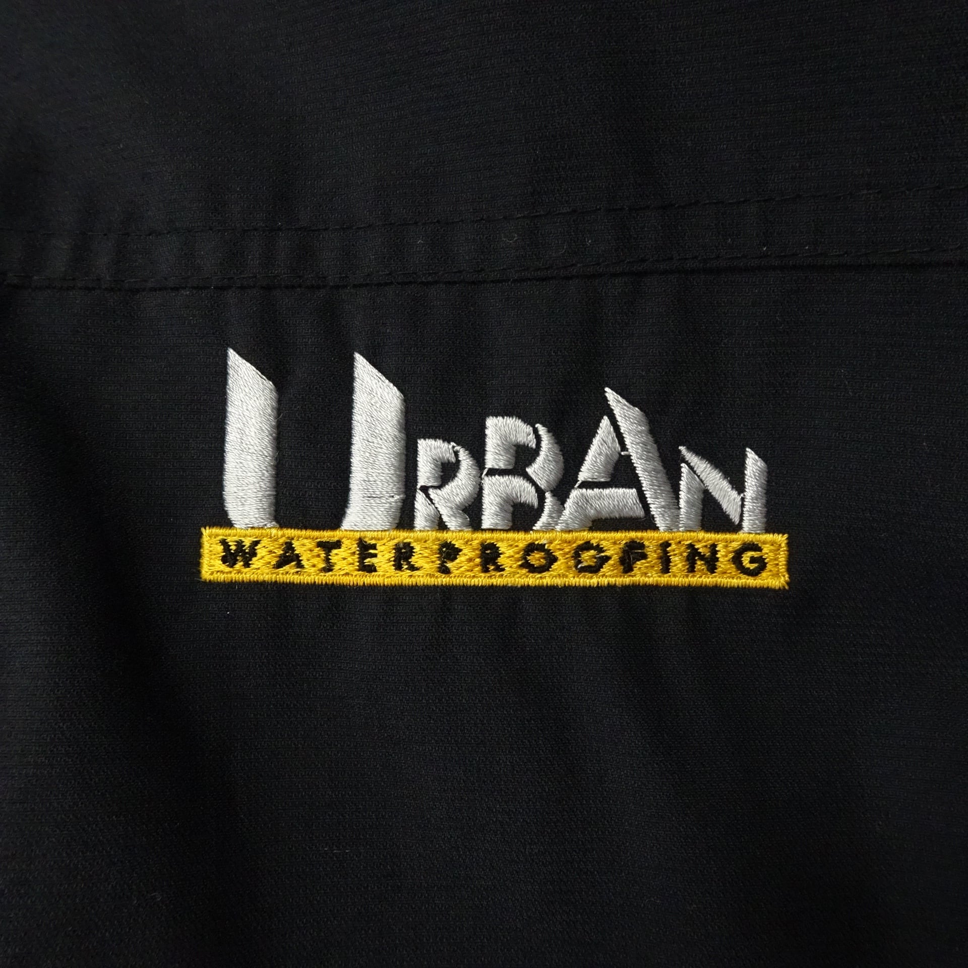 袖にはロゴ刺繍、胸には「URBAN WATERPROGFING」というアメリカの企業の刺繍がされています。