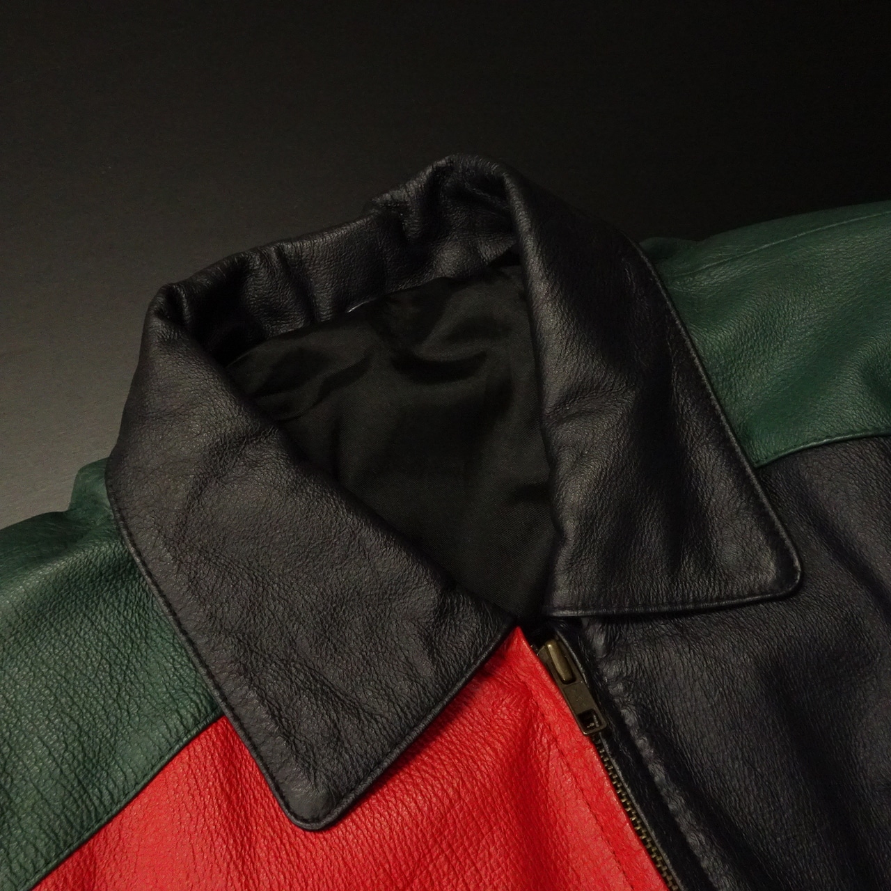 ブラック・グリーン・レッドの豚革を使用したパッチワークデザイン。