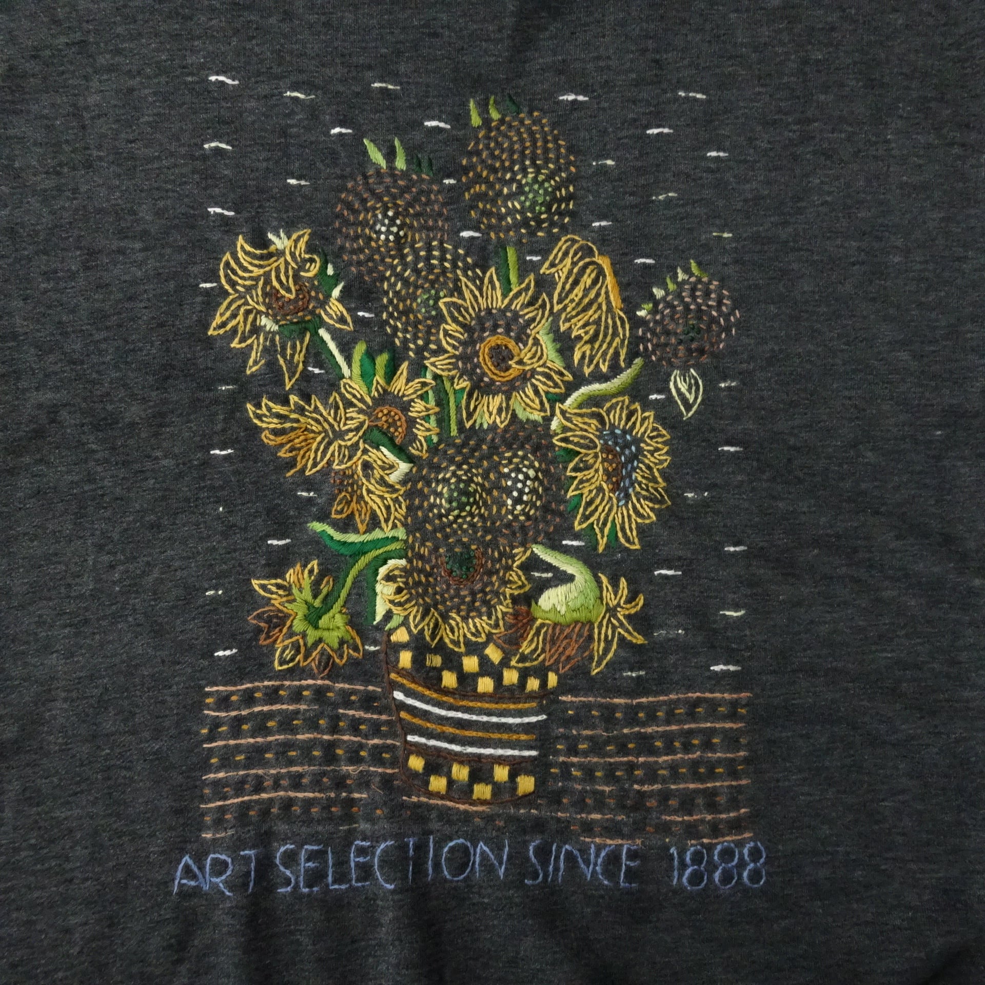 こちらはオランダの画家、ファン・ゴッホの名画「ひまわり」が刺繍されたデザイン。1988年の初期モデルです。