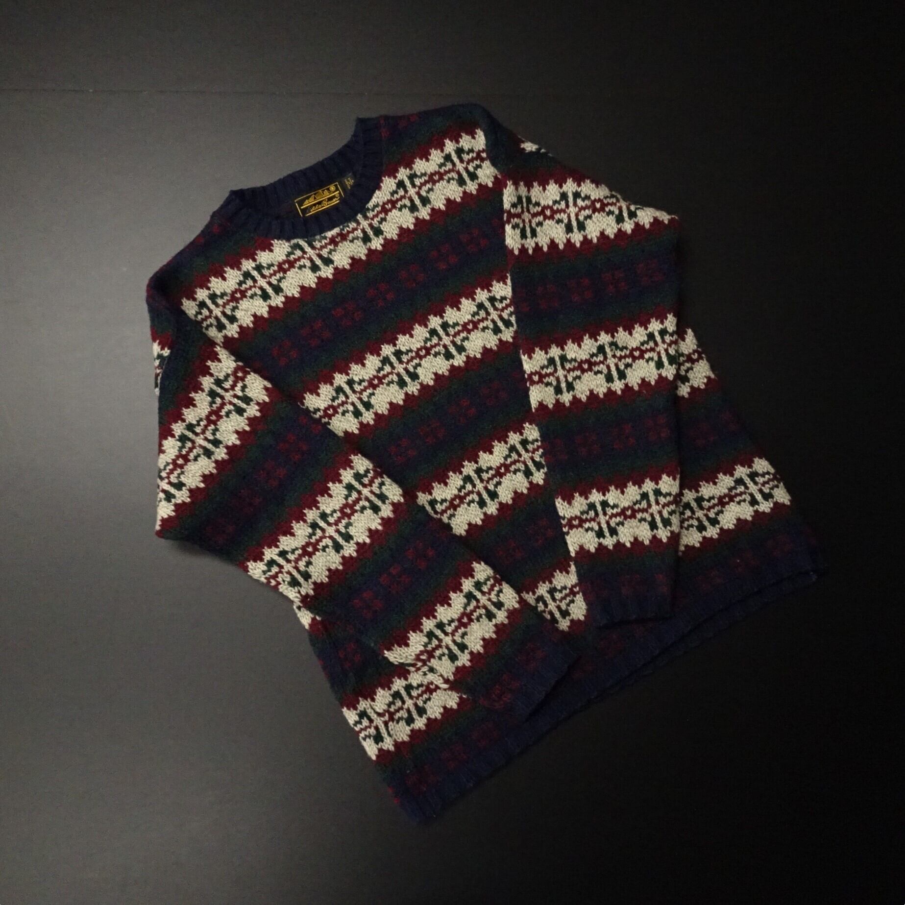 80s USA製 Eddie Bauer エディーバウアー 長袖セーター 黒タグ スノーフレーク柄 総柄 80年代 ネイビー