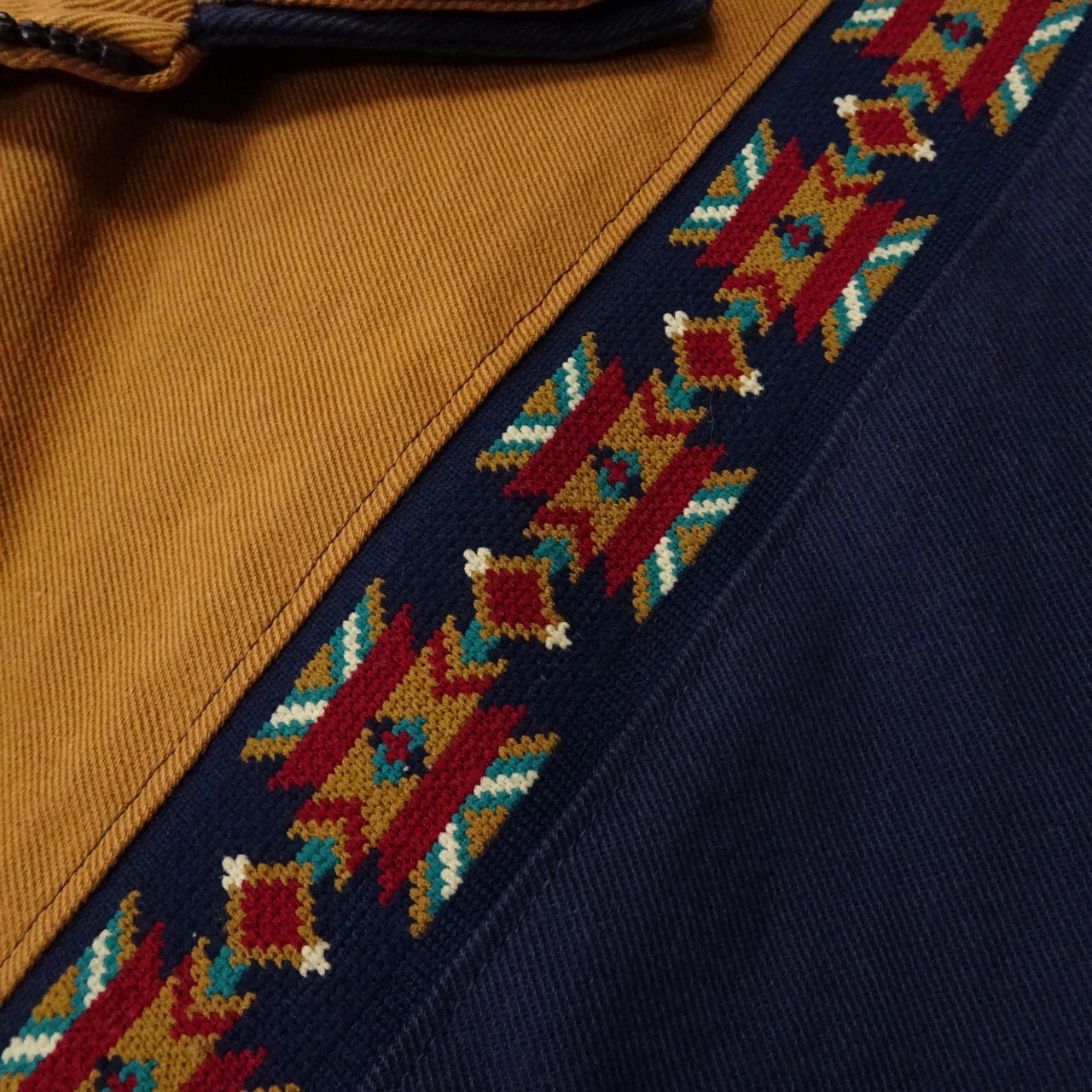 襟が二重になっており、前後に大きなVの切り替え・ネイティブ柄のデザインが特徴的。