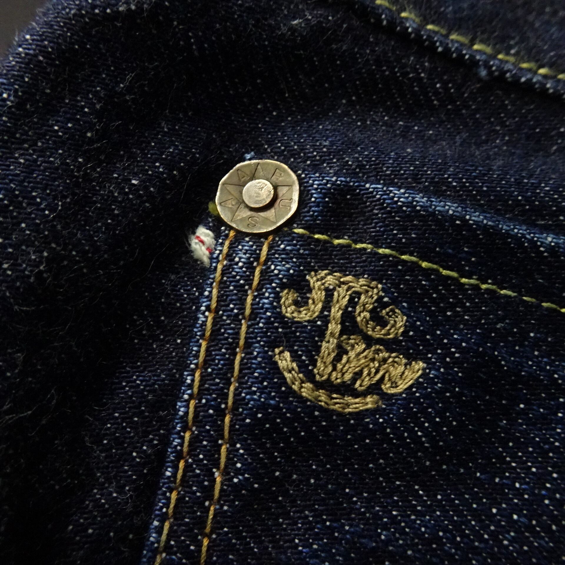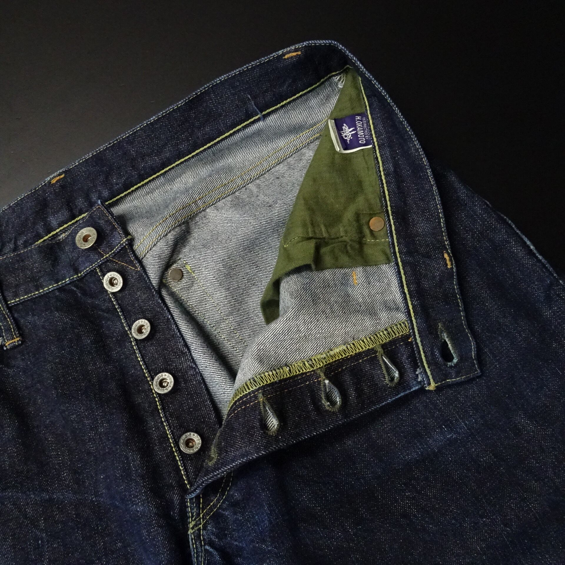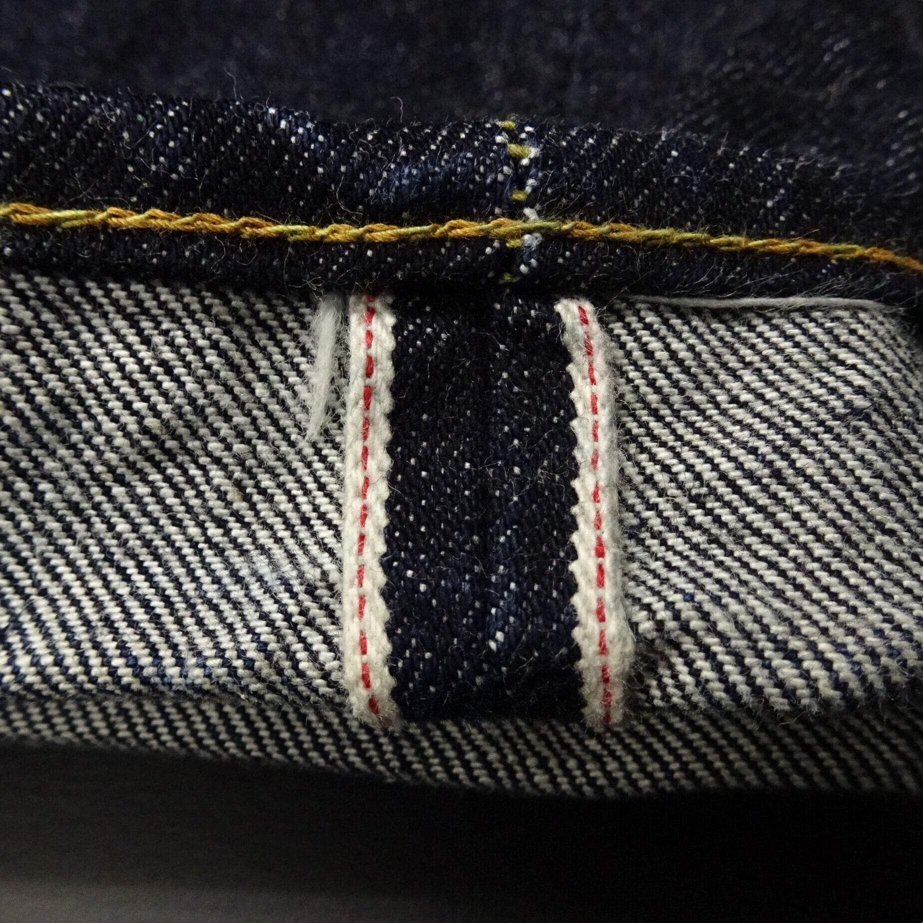 赤耳・Vステッチ・月桂樹ボタンなどスペックにも拘りのある一本。