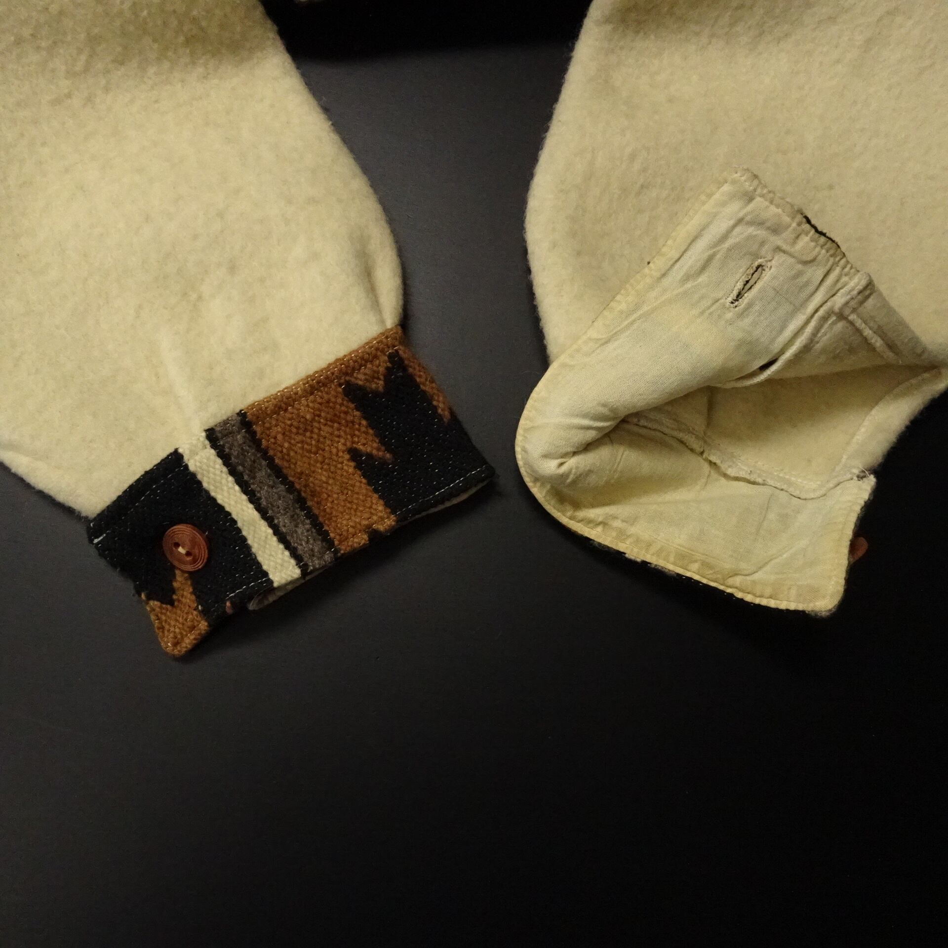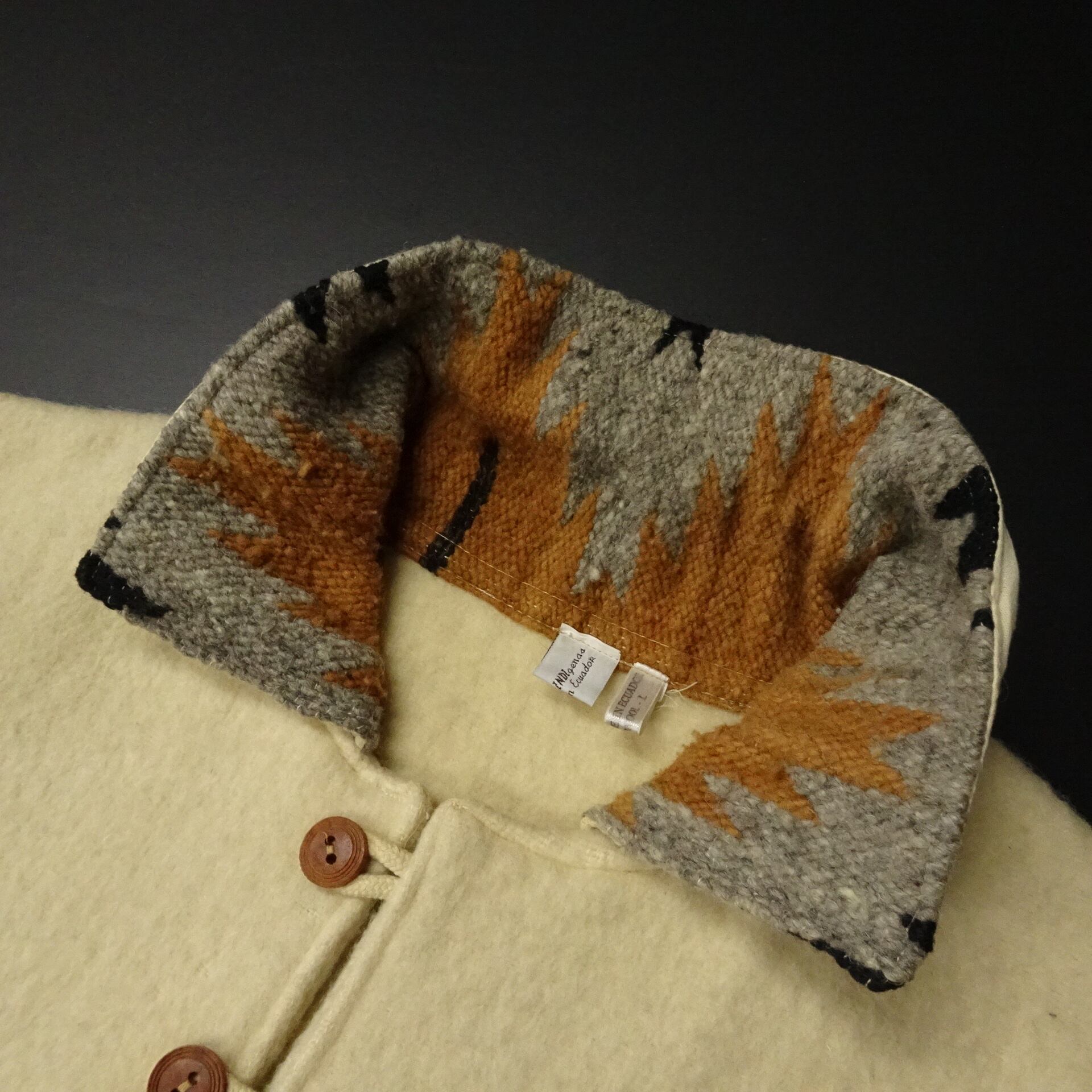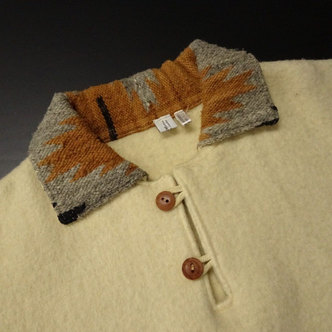 肉厚なウール素材のボディで、襟・袖口・ポケットにはチマヨ柄ブランケット仕様。
