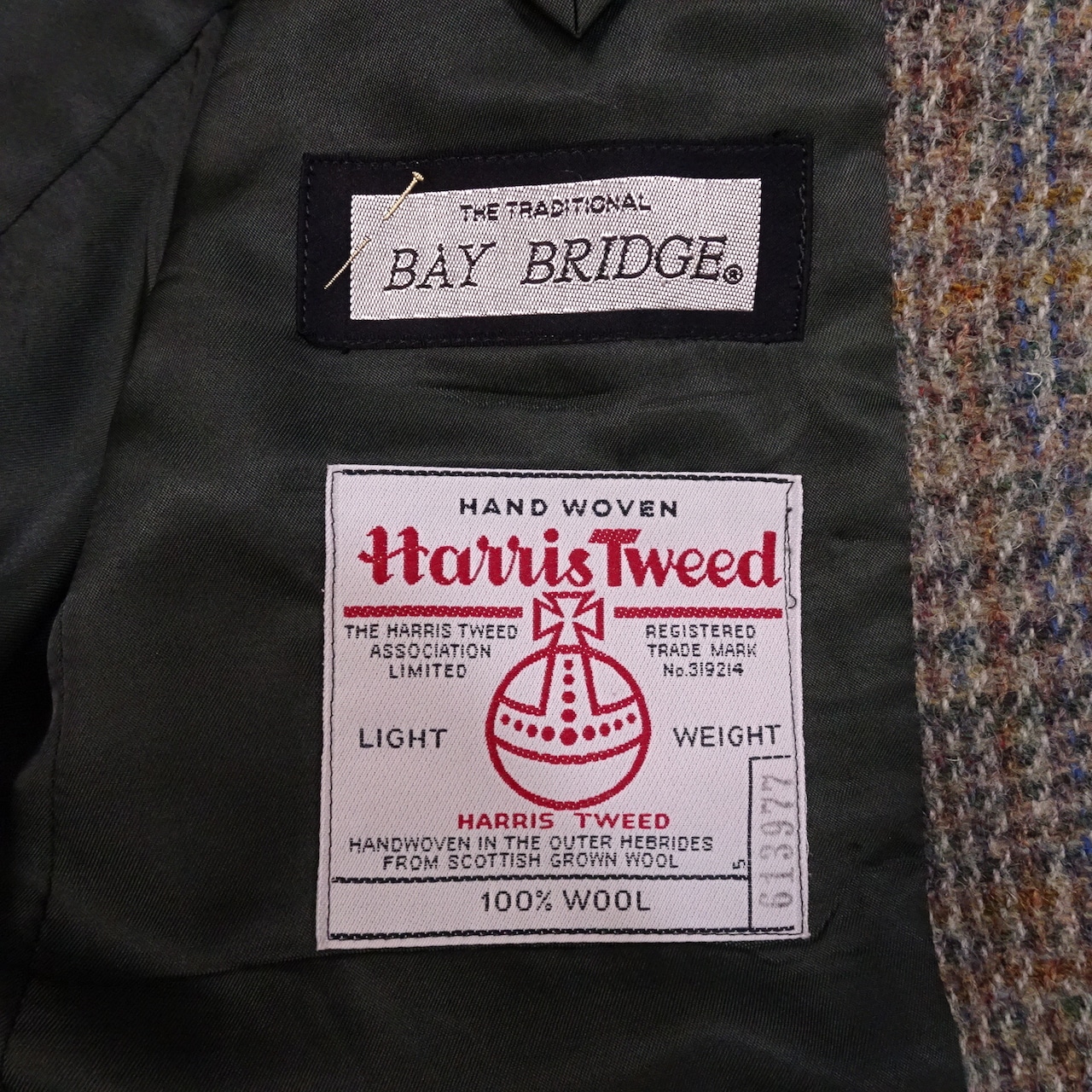 90s- BAY BRIDGE × Harris Tweed ベイブリッジ × ハリスツイード テーラードジャケット ウール ツイード くるみボタン サイドベント 90年代~ オリーブ ブラウン | 古着屋 0413