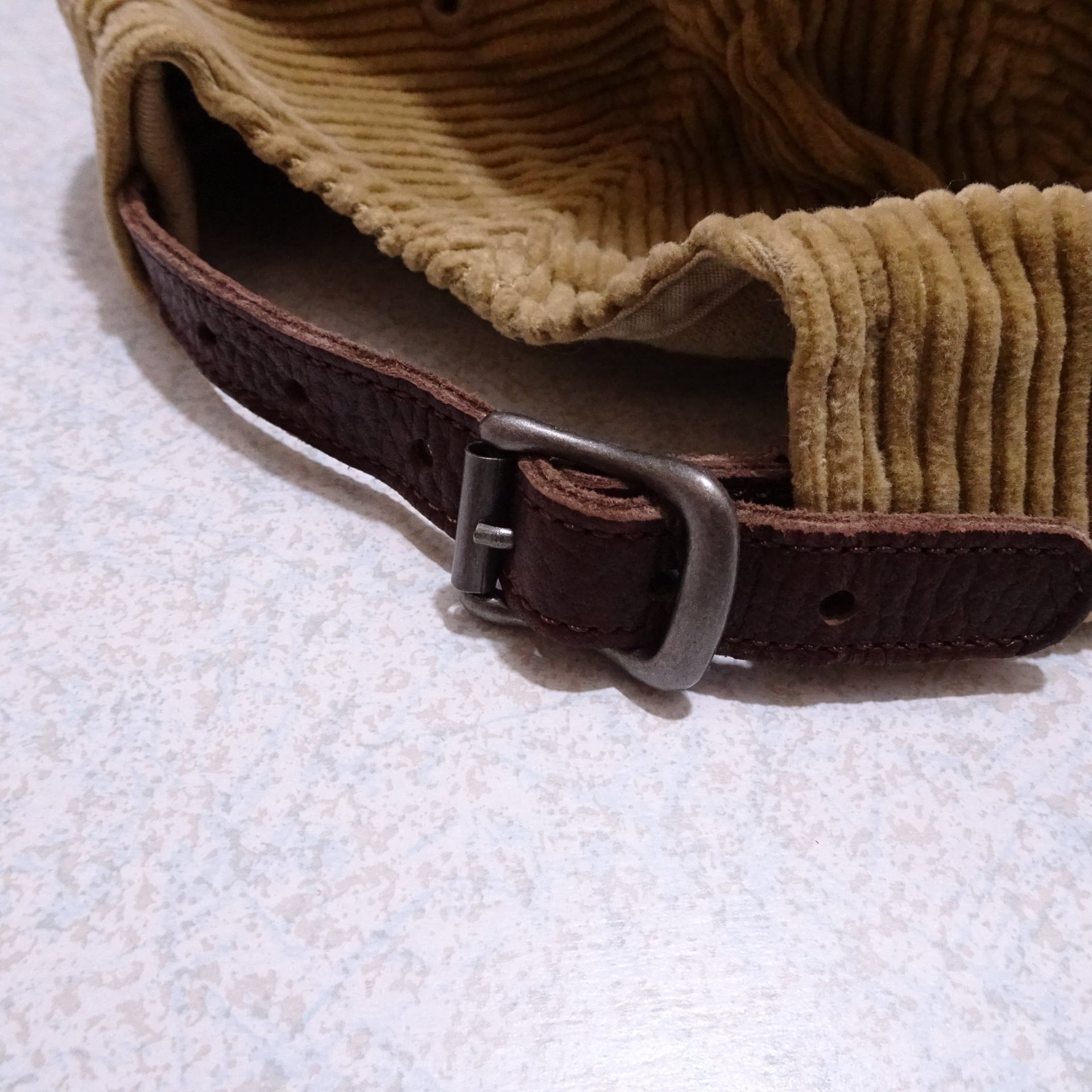 こちらは人気の6パネルの太畝コーデュロイで、ベルトにはレザーが使用されたデザインです。