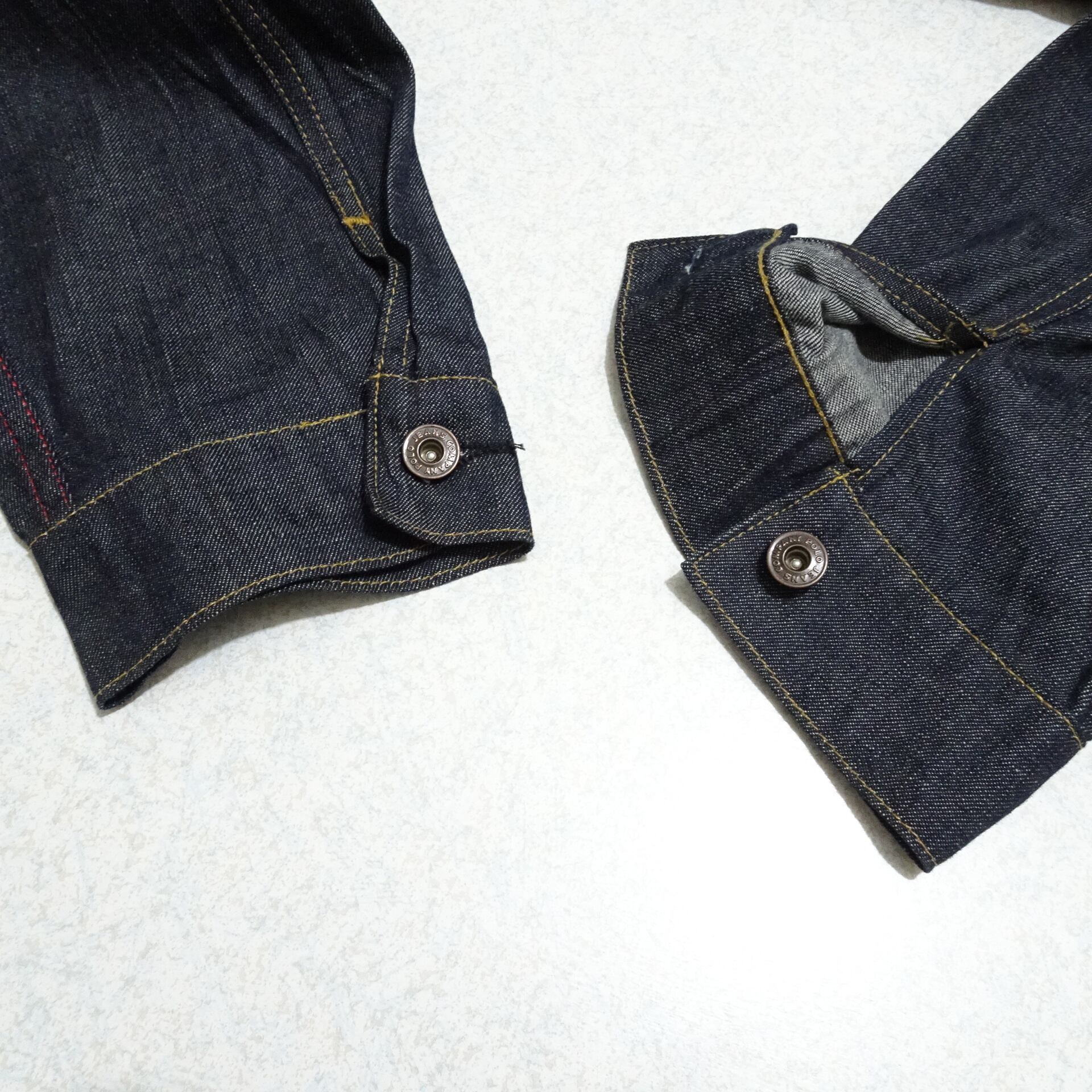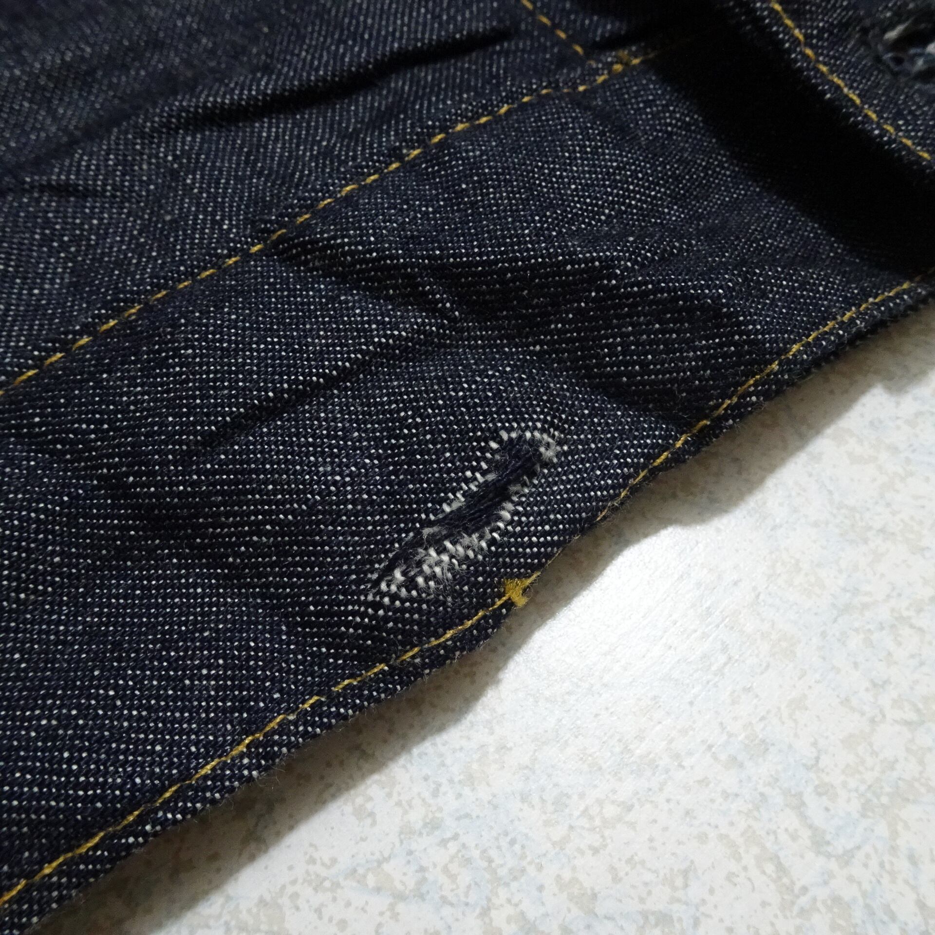 こちらは三角タグの濃紺カラーで、ステッチには赤とオレンジが使用されてます。