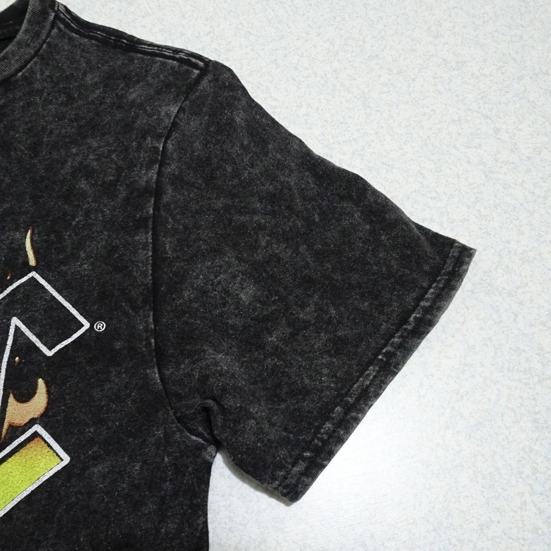 ヴィンテージ加工のボディの両面プリントで、HELLの部分にはモザイクになってます。