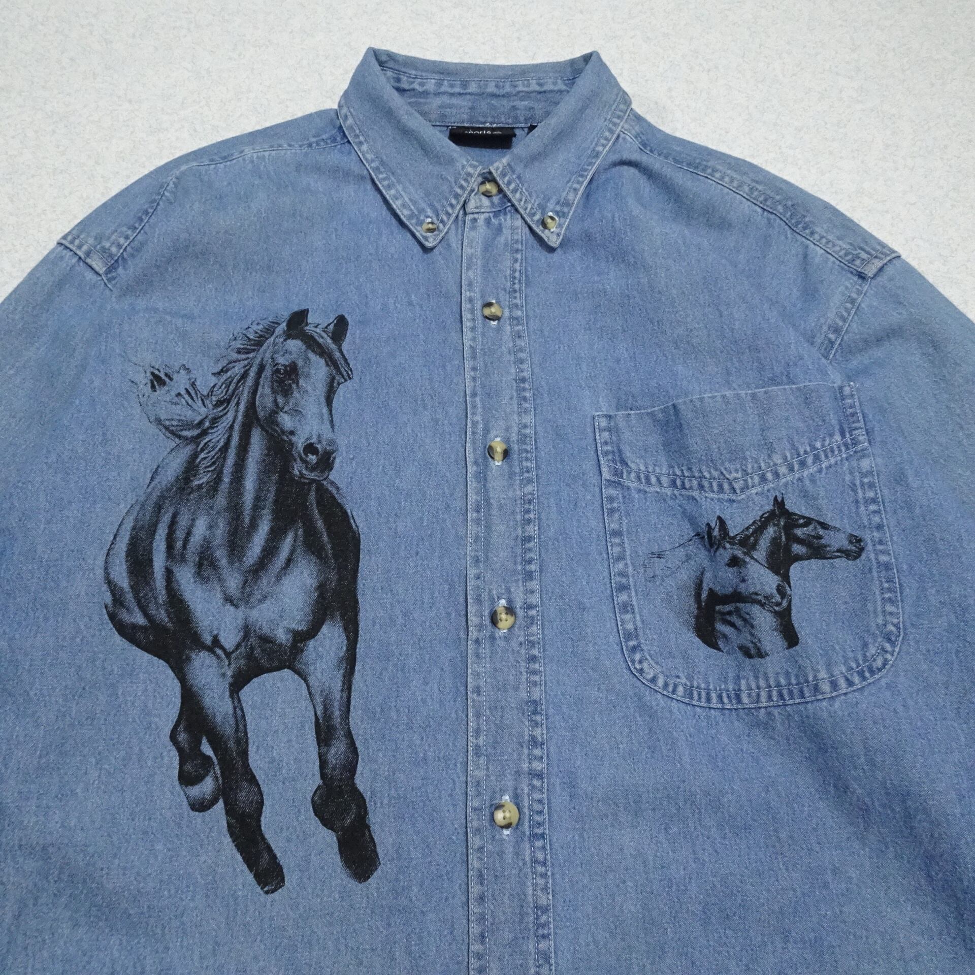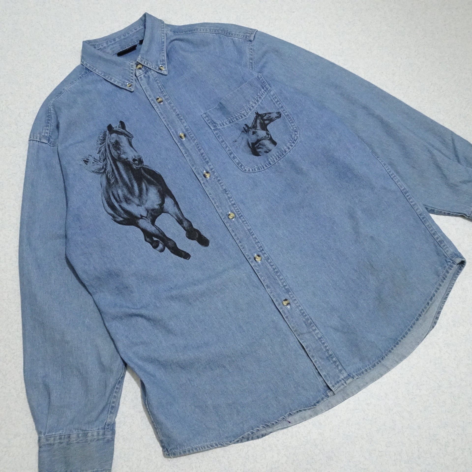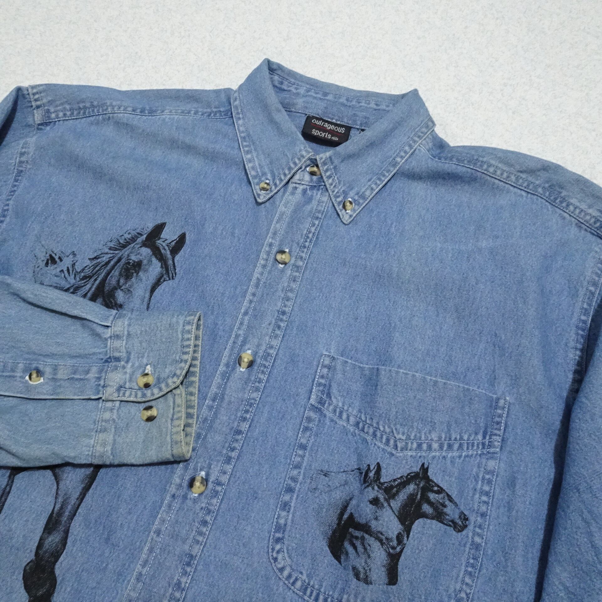 Outrageous sports / Ls Shirt / Horse Print / Denim / Blue / 90s / Vintage