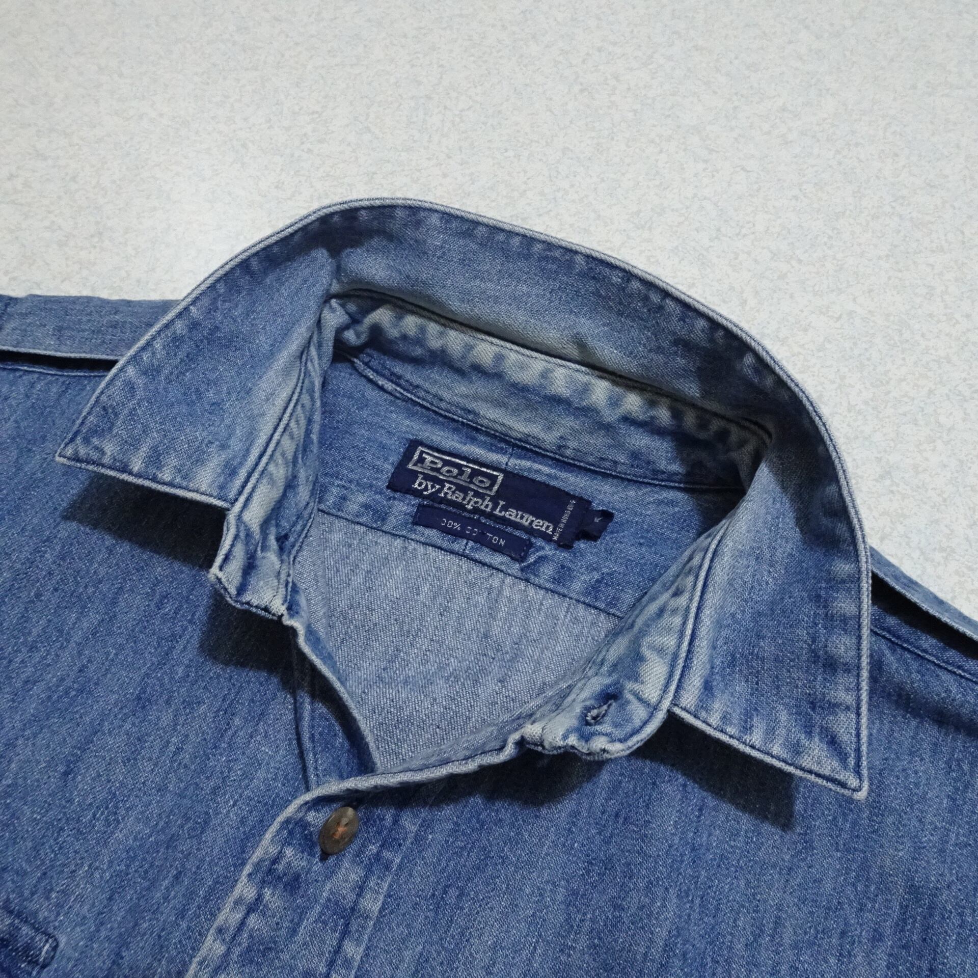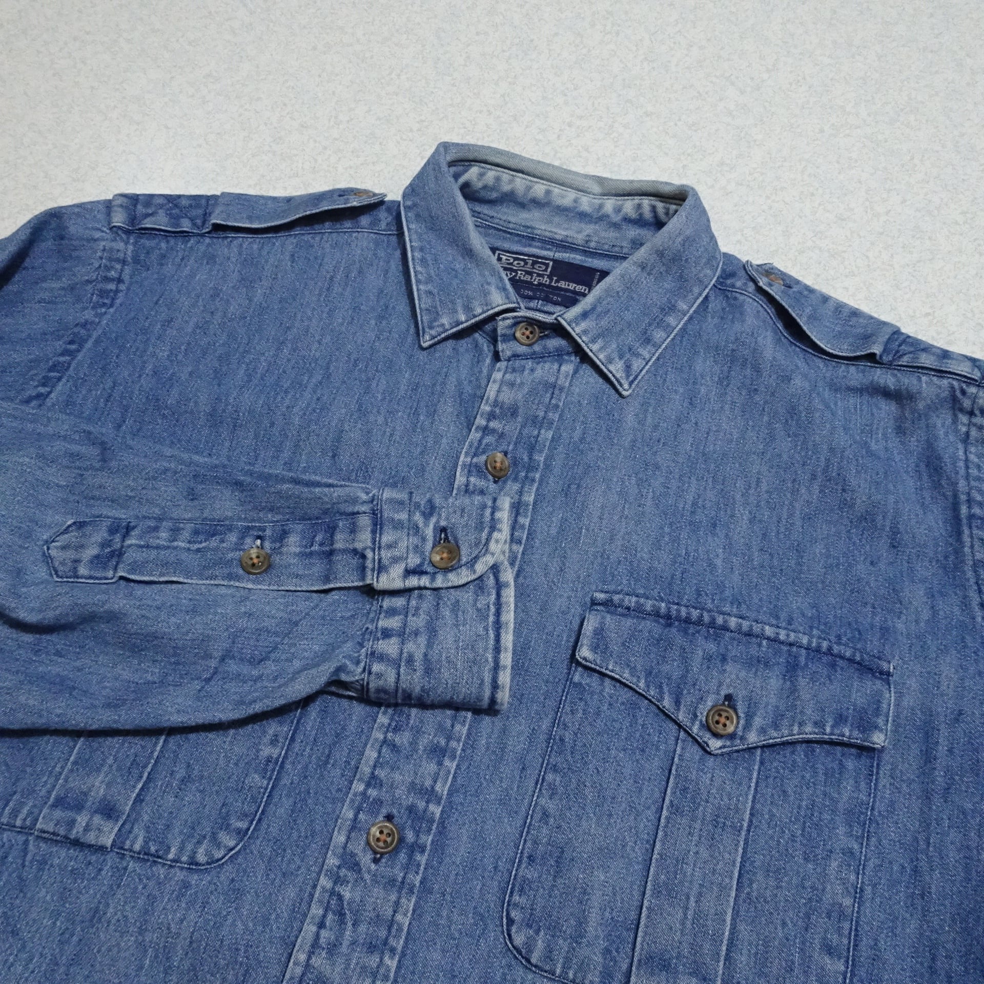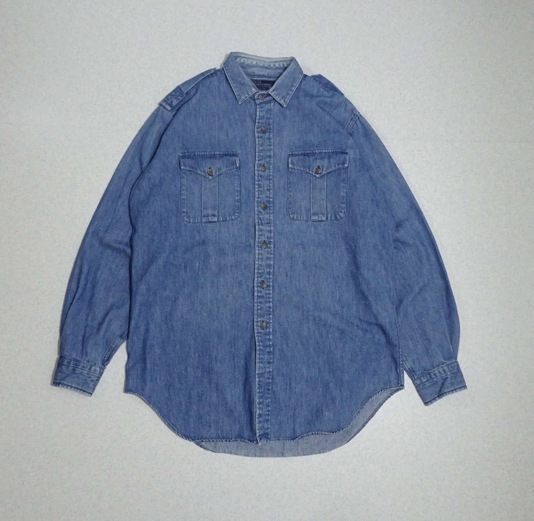90s 香港製 Ralph Lauren ラルフローレン 長袖デニムシャツ ダブルポケット エポレット 希少 90年代 ブルー系