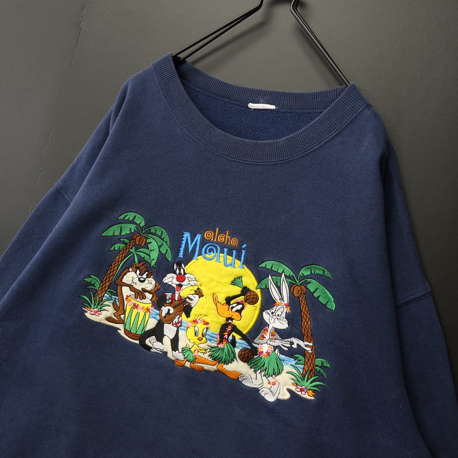 90s Vintage US古着☆LOONY TUNES ルーニー テューンズ 長袖スウェット 刺繍 アロハ マウイ ビッグサイズ ネイビー 90's 90年代 希少デザイン