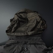 ワッペンが身頃を袖に付いていて、フードは折り畳み可能。
