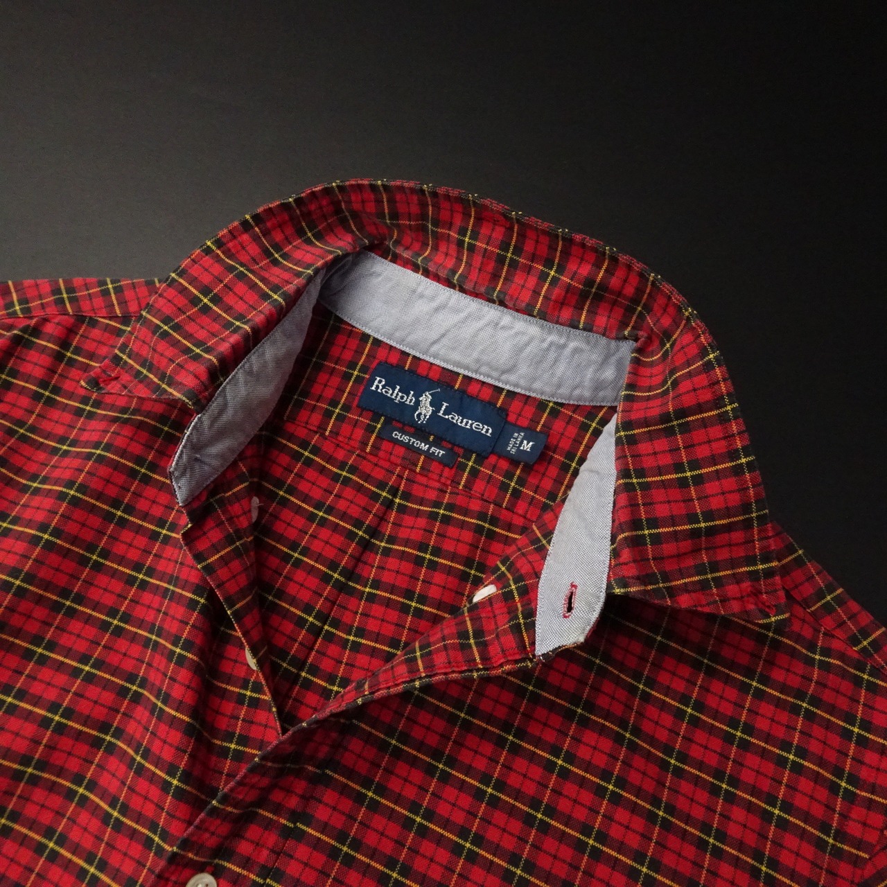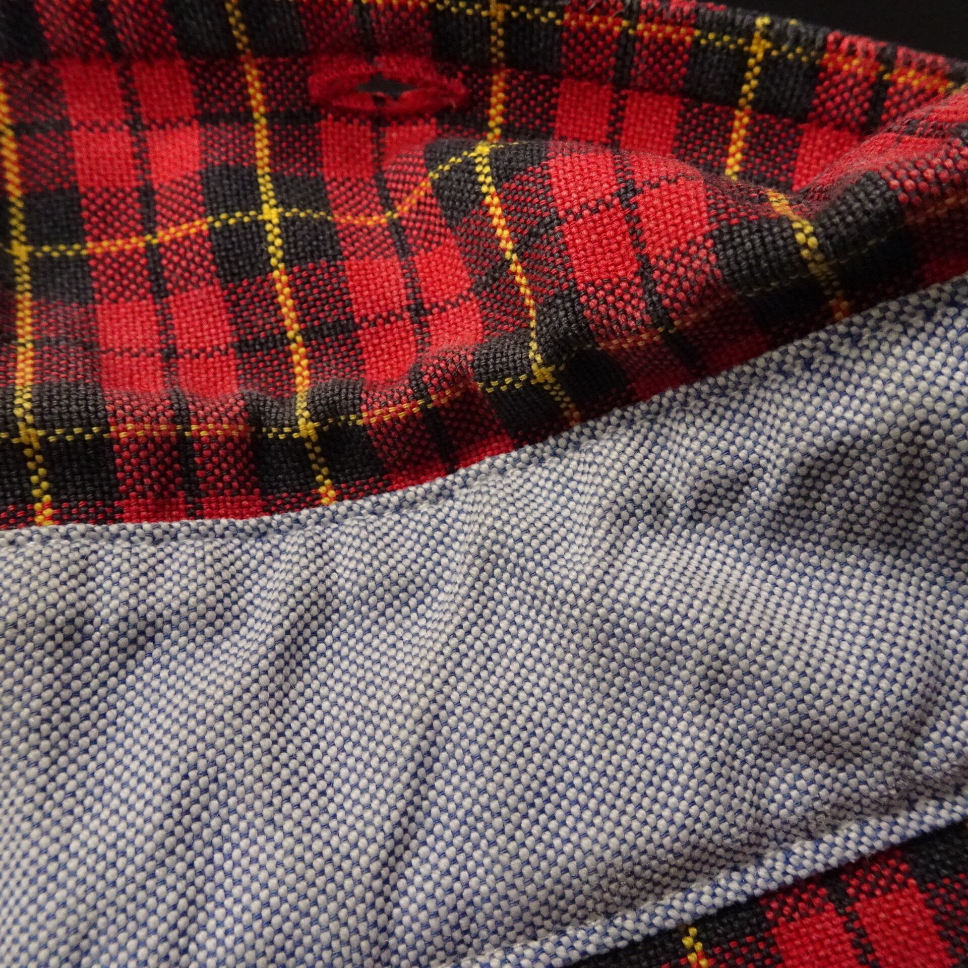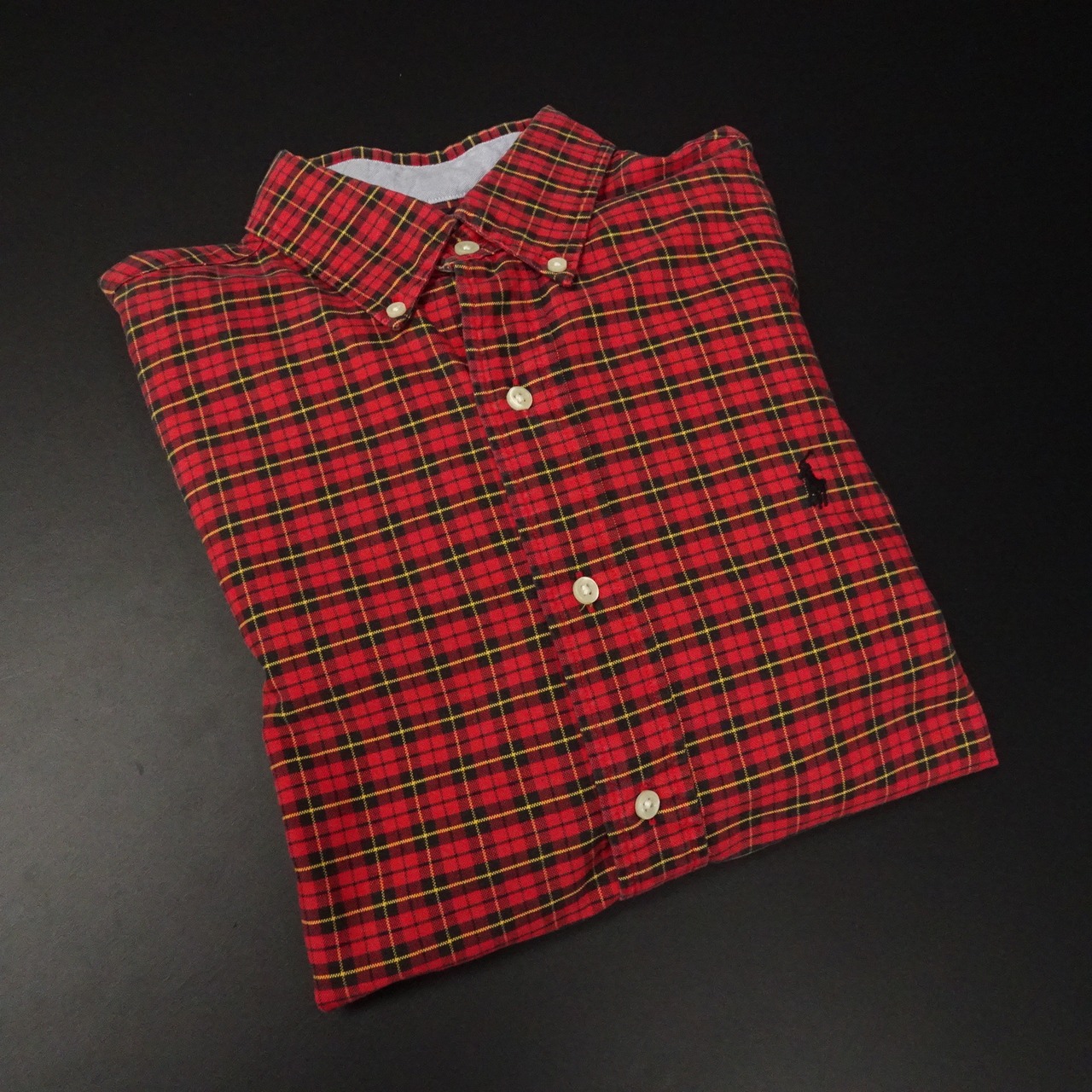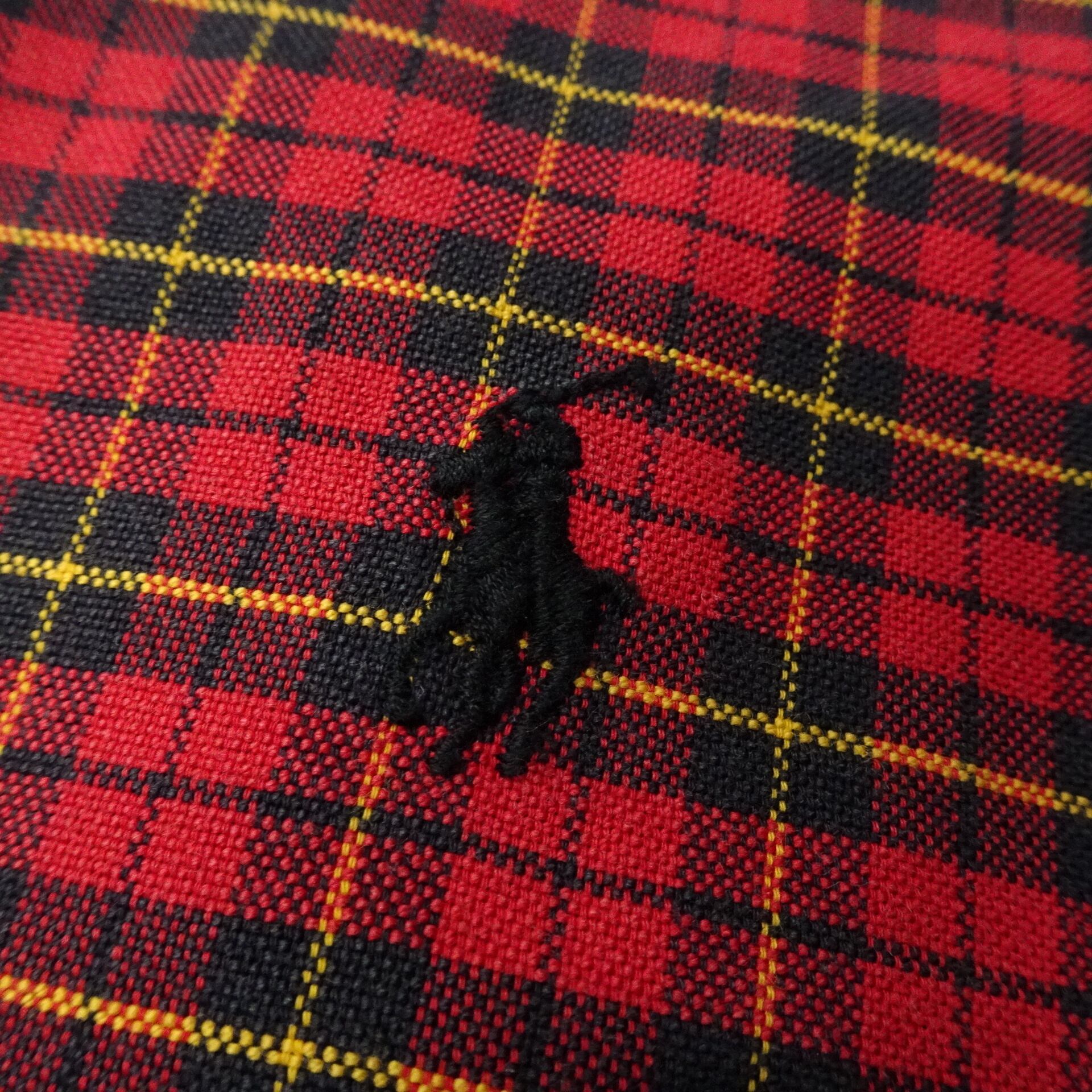 ボタンダウンでチェック柄。レッドベースにイエローライン。